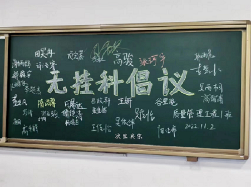 由班委牵头的 “无挂科倡议”活动把班会推向了高潮,同学们争相走向讲台,庄重的写下自己的名字,立志在大学四年无挂科。这展现了质管22级1班大家庭自强不息,充满斗志的良好精神面貌,同学们纷纷表示,以后一定好好学习,不给班级抹黑。