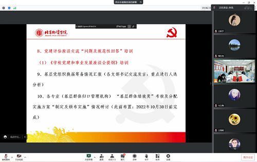会议伊始,公司党委副书记孙涛就2022年11月党员、教职工理论学习计划进行了安排,要求党员、教职工要高质量完成理论学习,同时就学院层面疫情防控专班工作、教工党支部书记和员工党支部书记层面疫情防控工作责任任务进行了部署,就《北京普通高等公司党建和思想政治工作基本标准》检查工作进行了下一步工作部署,就基层党组织换届筹备、2023届毕业生专业党支部就业促进会等相关工作进行了强调。随后,孙涛老师重点对2022年党建评估座谈名单、党建评估学院内调研走访路线及各节点任务进行了详细梳理,同时针对党建评估座谈交流“提纲”开展了相关业务培训。