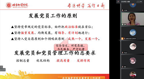 首先对发展党员工作原则进行讲解,要把政治标准放在首位,明确发展党员入党动机以及发展党员和党员管理工作的总要求,对发展党员进行综合考量,提高党员质量让党员充分发挥作用。党课着重介绍了发展党员的各项程序,同时各员工党支部书记老师强调了入党过程中的各时间节点,给出了入党发展的时间轴,使入党积极分子对发展党员程序有了更清晰地认识。