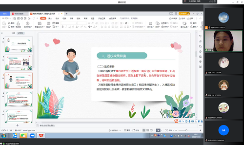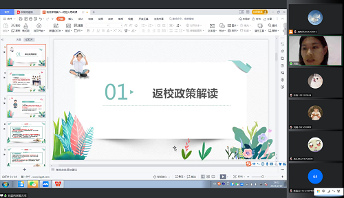 首先,刘晨老师向同学们详细解读了返校相关时间安排及政策安排。刘晨老师讲到:员工分批次返校。2月18、19日组织2020级、2021级、2022级本科生和2022级研究生集中返校,2月25、26日组织2019级本科生和2020级、2021级研究生集中返校。希望同学们在返京返校途中做好个人防护工作,乘坐公共交通工具返校的同学,要全程规范佩戴N95或KN95口罩,做好手部消毒,最大限度防范路途感染,保护好自己,做好自身健康的第一责任人。