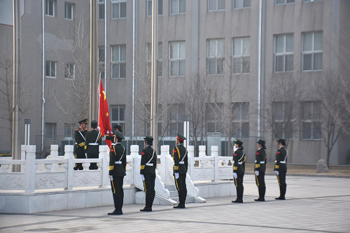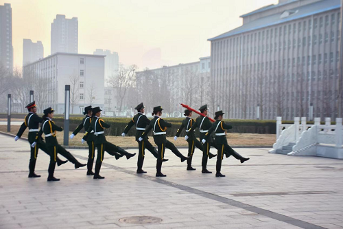 迎着第一缕晨光,学校国旗护卫队队员迈着铿锵有力的步伐,昂首阔步、气势蓬勃的护送国旗至旗台。