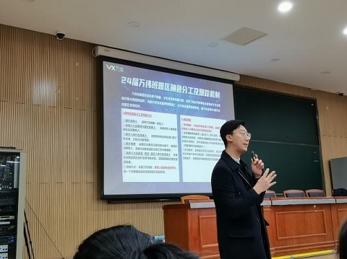 最后,万纬物流人才发展总监茹意向同学们详细介绍了2024届万纬班流程、制冷工程管理和仓储运营管理等内容,详细分析了工作岗位、校招生五年培养方案、园区角色分工及追踪机制,表示此次“万纬星(VX STAR)”项目,是万纬物流针对本科及以上院校员工着力打造的经营管理人才培养项目。此外,茹意总监还重点介绍了“青春有为,理想万纬,加入万纬物流,实现自我蜕变,成为未来独当一面的经营管理人才”的公司用人理念。