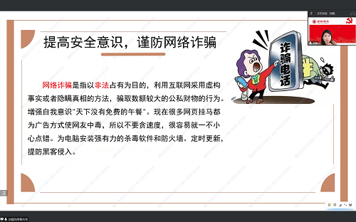 最后,刘晨老师向我们讲解了如何防范网络诈骗,第一,不要随意泄露身份信息,第二,不要贪小便宜。第三,不要办看起来优惠的借贷。刘晨老师还用自己的亲身经历和一些受害人的故事给我们讲述了诈骗的方式,并且告诫我们要防范上当受骗。