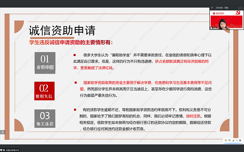接着,刘晨老师讲解了诚信考试及诚信资助申请的内容。先给大家列出了员工违反考试纪律的违纪处分办法,告诫同学们要有自我约束和自觉追求。在考试过程中要端正学习与考试的态度,严格遵守考试规章制度,实事求是,杜绝一切考试作弊形式。然后又给大家列出了员工违反诚信资助的主要情形,提醒大家要将资助用于正当途径上,不要有侥幸心理,不要出现失信行为。