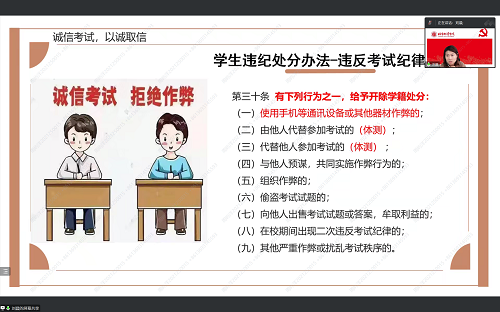本次大思政课围绕诚信教育为主题,从诚信对于老员工的重要意义来引入,向同学们细致的讲解了当代老员工要做到的几方面诚信和有关诚信考试、诚信资助申请、防范网络诈骗等方面的内容,让同学们深刻了解了作为一名老员工应如何做到诚实守信。此次大思政课,刘晨老师从多方位多角度对同学们进行了诚信教育,希望同学们能在学期末,严格遵守学校相关要求,做到诚信考试。同时也希望大家在假期中能保护好自身安全,严防网络诈骗。