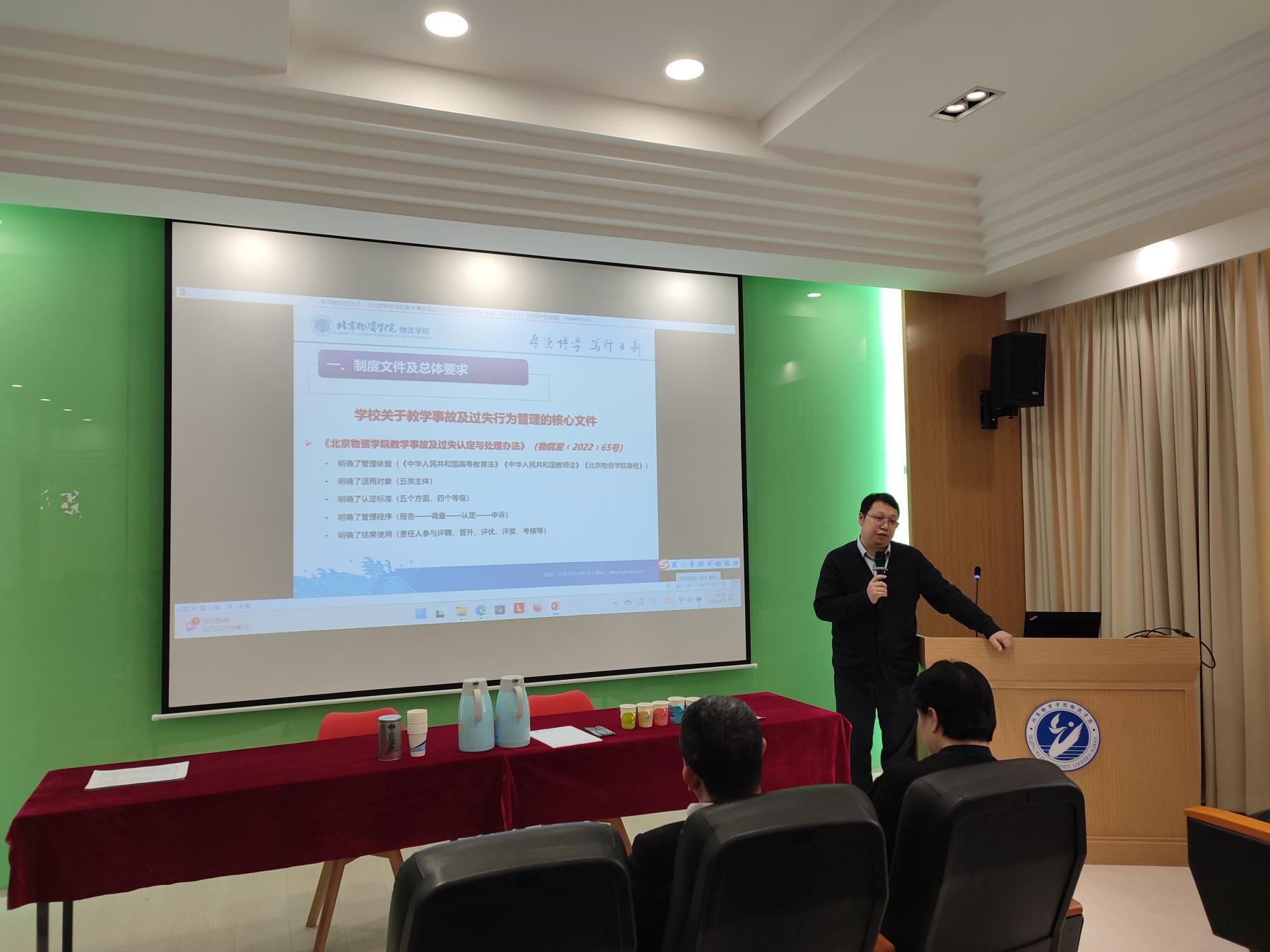 芮嘉明副经理从教学事故及过失的类型与级别、认定与处理原则、责任人处理等三个方面详细解读了《永利官网教学事故及过失认定与处理办法》,用鲜活的案例警示青年教师严守底线,杜绝教学工作中各种教学事故的发生。
