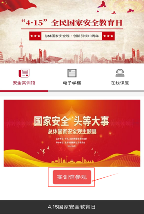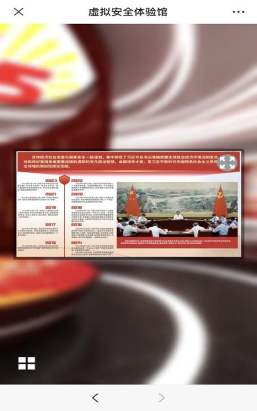 (二)点击【安全实训馆】页面,点击【实训馆参观】,进入总体国家安全观虚拟展馆参观界面,点击页面下方场景进行场景切换。