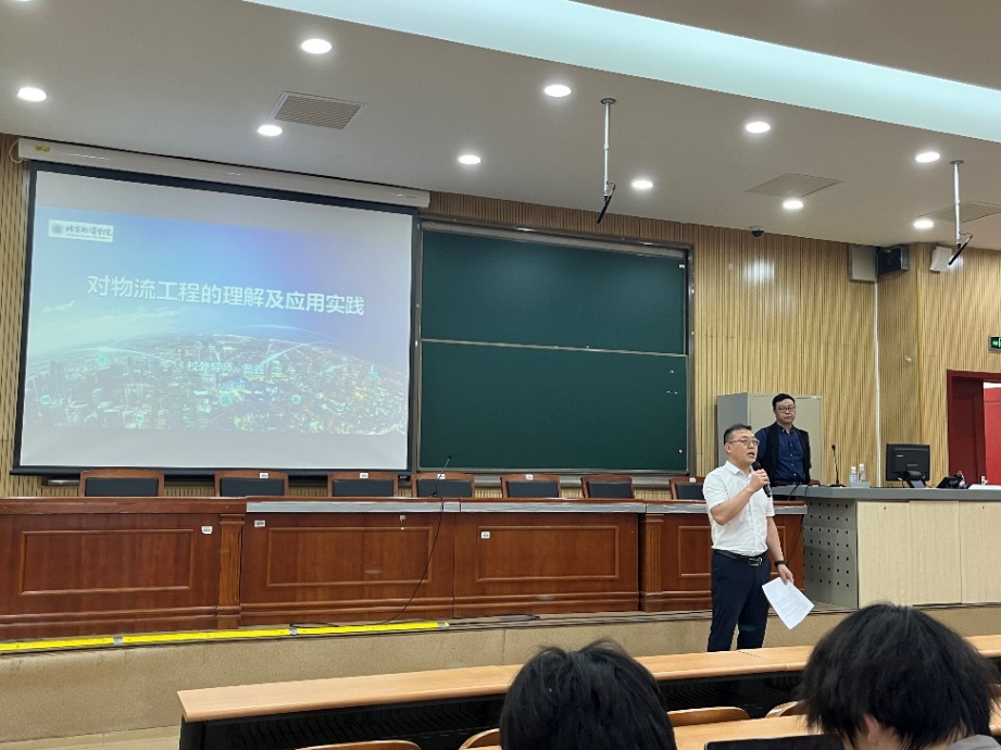 贾鑫经理围绕物流工程是什么、物流工程的具体实践以及物流工程对我们未来的启示等三个方面为同学们讲解物流工程的含义及实践应用。他通过国内外大型工程案例向同学们讲述实现物流工程的目标和物流工程的核心要素。同时以汽车行业全产业链系统、中外运关务系统为例,讲解了物流工程的应用实践、大语言模型和自动驾驶技术等前沿技术在物流行业的实践应用。最后,他对同学们提出要求,希望同学们要密切关注物流行业发展动向,保持持续学习的状态,要有成熟的思维,从消费者过渡到生产者,找准自己前进努力的方向,克服重重困难成为物流行业的专家。