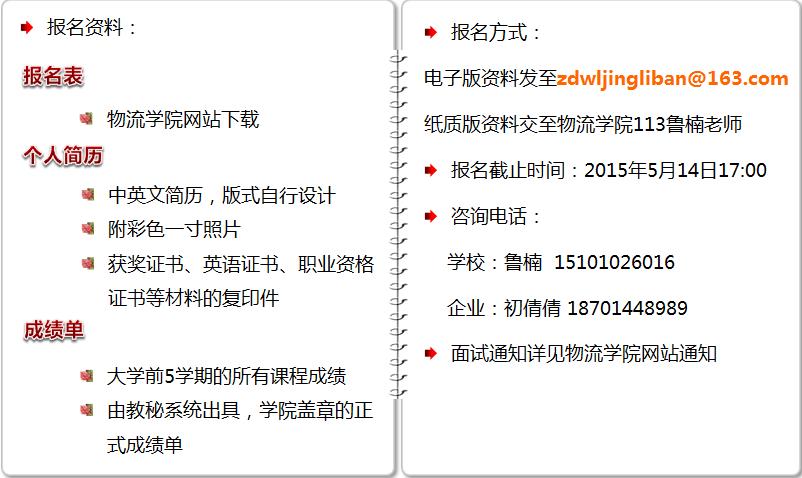 第四届“中都物流经理班”报名通知 来源:永利集团 发布时间:2015-05-13 浏览次数: 次 1. 需要提交的材料 2.申请人需要对所提交材料的真实性负责,如材料不真实学院将有权取消申请人资格,并要求申请人赔偿由此产生的相应费用。 3.所有材料提交的截止时间是5月14日下午17点。 报名表详见附件 附件【中都物流经理班报名表.doc】已下载次