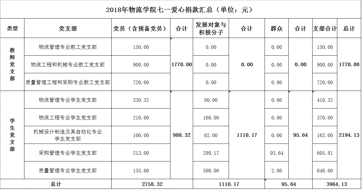 关于开展2018年“共产党员献爱心”捐献活动情况公示 来源:永利集团 发布时间:2018-06-27 浏览次数: 次 2018是建党97周年,为弘扬中华民族的传统美德,按照市委组织部和市委教育工委通知要求,公司党委组织部在“七一”前组织各基层党组织开展“共产党员献爱心”捐献活动。 公司党委动员和引导广大党员踊跃捐献,并将爱心捐款交付公司党委组织部,现将捐款情况公示如下: 捐款金额(单位:元) 参与捐款的党员人数(不含流动党员) 参与捐款的流动党员人数 参与捐款的入党积极分子人数 参与捐款群众人数(不含入党积极分子) 3964.13 110 0 132 13